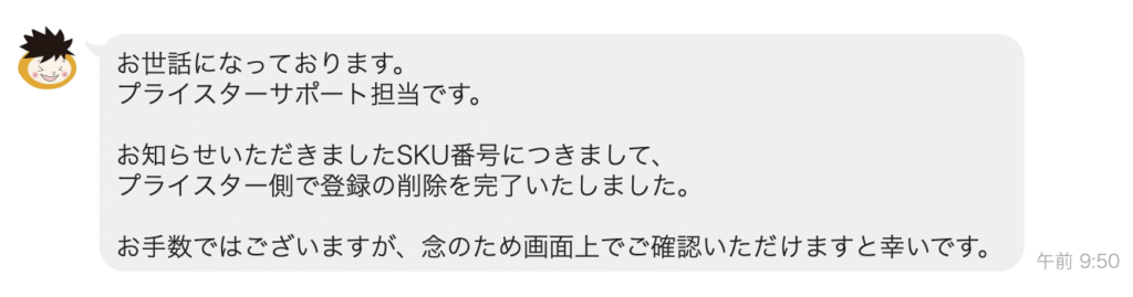 SKUの削除でエラーが出て、プライスター上で削除できませんでした。