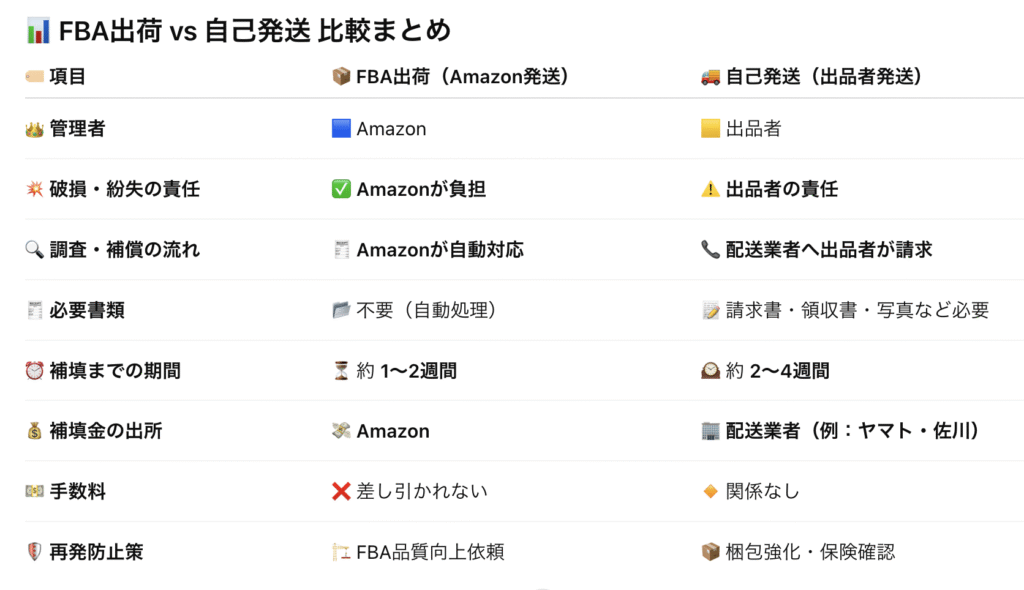 📋 最後に:FBAと自己発送の違いを一目でチェック!