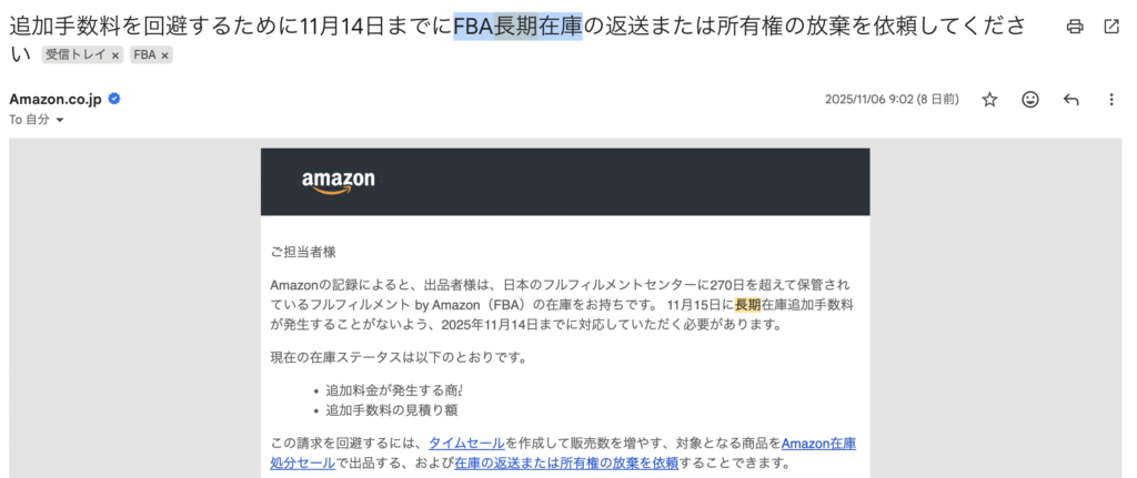 🟥「FBA長期在庫」関連のメール