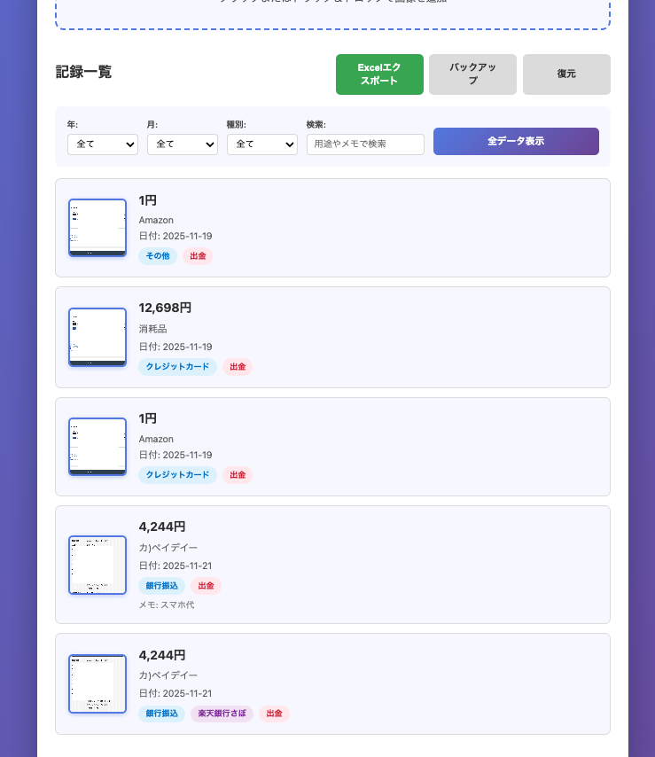 - ソートで月別・用途別に並び替えできる