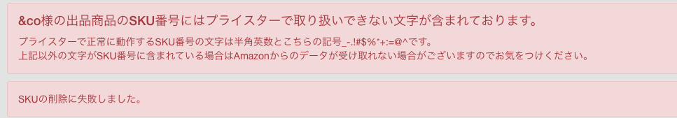 このエラーは、「SKUにプライスターが読めない文字が入っている」ことが原因です。