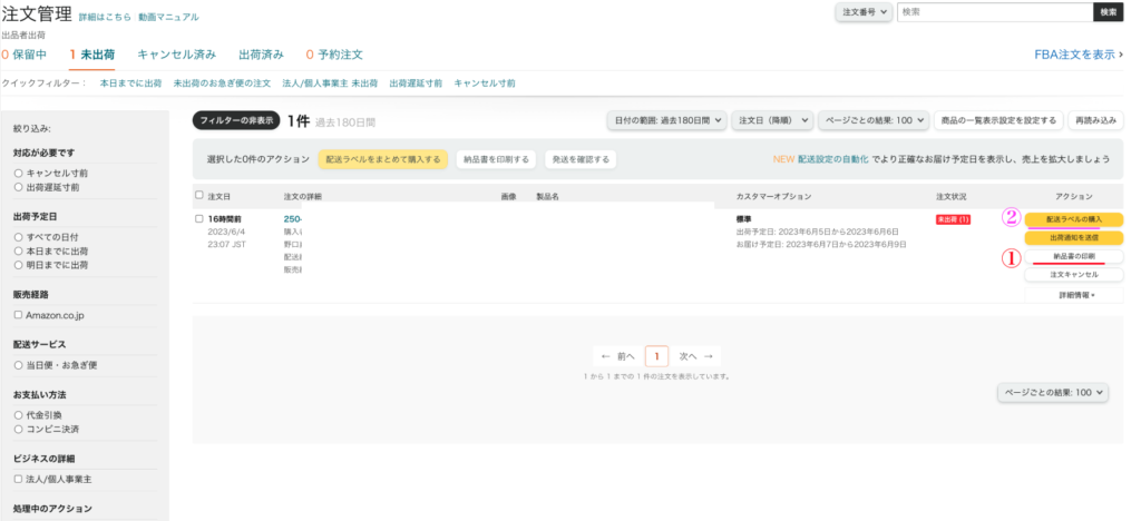①納品書の印刷→②配送ラベルの購入
