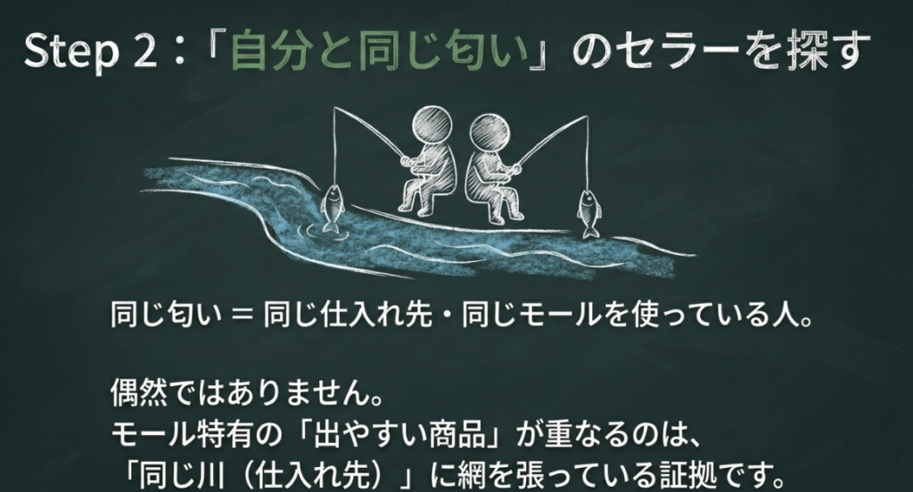 自分と同じ仕入先・同じモールを使っていそうなセラーのこと。